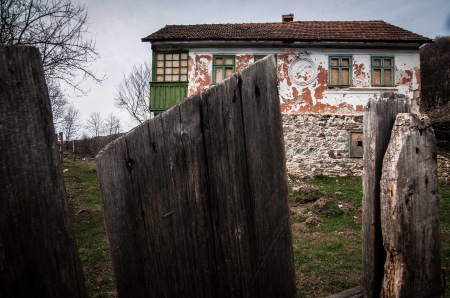 Rosia Montana’da terkedilmiş bir ev. RMGC tarafından satın alınan evin duvarında madenciliğin sembolünün yanısıra evin inşa tarihi de gözüküyor.