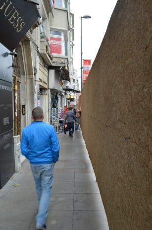 Lüks bir saat mağazasının çalışanları “bugün siftah yapmadık” diyordu saat 20:00 civarında: “Ben bu şekilde bir ay dayanamam. Bu projenin çok fazla sorunu var. Örneğin önümüze çekilen duvar güvenlik açısından büyük bir tehdit oluşturuyor. Yüzlerce metre aralıksız devam eden duvardan insanlar acil bir durumda nasıl yola çıkacak? Bir deprem, yangın anında kendimizi sokağa atamayacağız, biri fenalaşınca ambulans gelemeyecek”. Çalışanlar Erdoğan’ın Esad’a söylediği “zulümle abad olunmaz” sözünü hatırlatarak “zulümle iş olur mu Erdoğan?” diye soruyor.