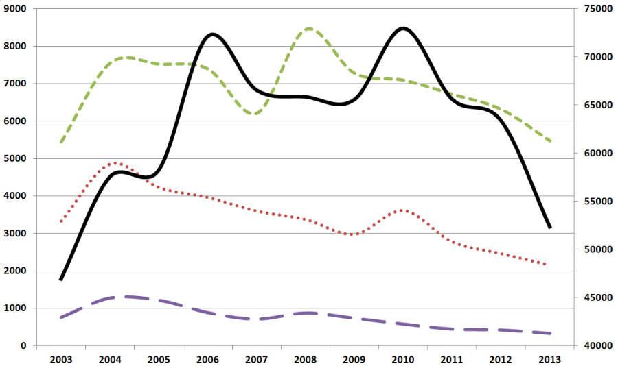 Kırmızı noktalı çizgi: Hürriyet ve Cumhuriyet gazetelerinde AB. Yeşil kesik çizgi: Hürriyet ve Milliyet köşe yazılarında AB ülkeleri. Mor uzun kesikli çizgi: Hürriyet ve Milliyet köşe yazılarında AB. Siyah düz çizgi (sağdaki ölçek): Hürriyet ve Cumhuriyet gazetelerinde AB ülkeleri