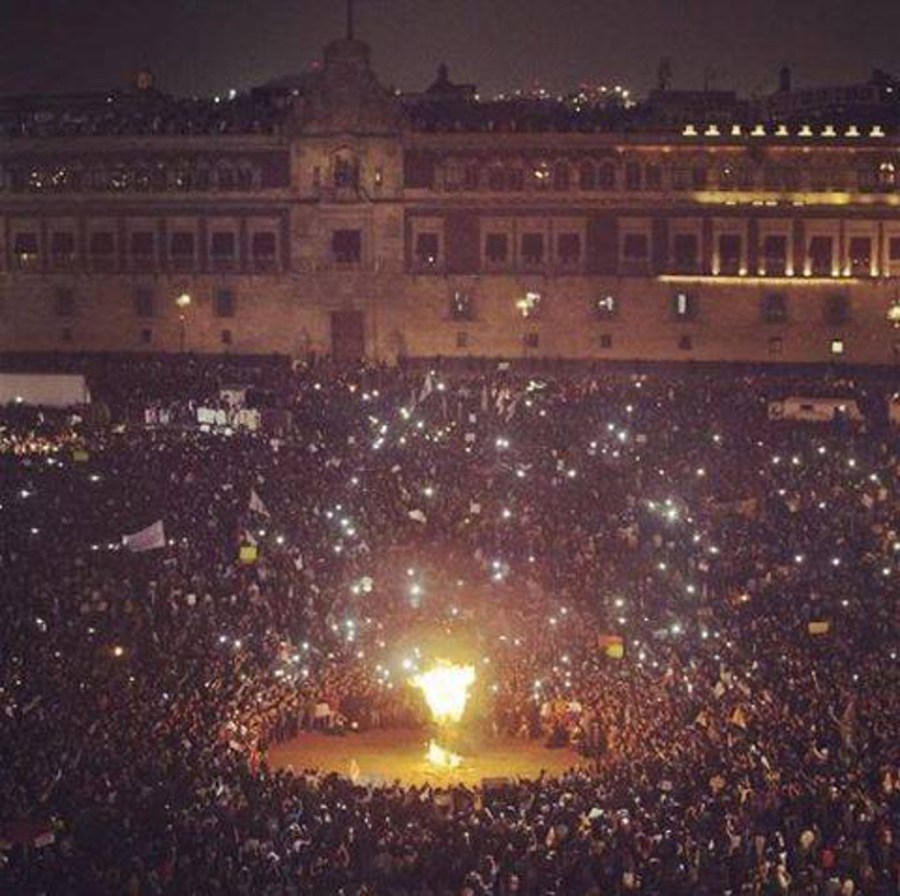 20 Kasım’da başkent Meksiko’nun ana meydanı olan Zocalo’da toplanan on binlerce eylemci Meksika Başkanı Enrique Peña Nieto Piñata’nın maketini ateşe verdi ve istifasını talep etti