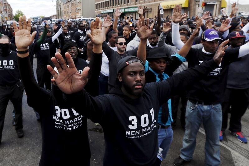 Members of the community stand between demonstrators and police officers after items were thrown and pepper spray used outside a recently looted and burned CVS store in Baltimore, Maryland, United States April 28, 2015. The day after rioters tore through Baltimore, the city’s mayor was criticized on Tuesday for a slow police response to some of the worst U.S. urban unrest in years after the funeral of Freddie Gray, a 25-year-old black man who died in police custody. Maryland Governor Larry Hogan said he had called Mayor Stephanie Rawlings-Blake repeatedly Monday but that she held off calling in the National Guard until three hours after violence first erupted. REUTERS/Jim Bourg – RTX1APJM